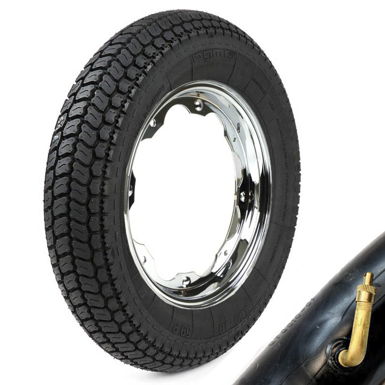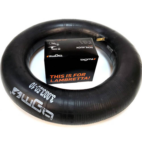 BGM Classic tubed 3.50×10 tyre on BGM standard split rim fitted with BGM Lambretta-specific innertube – delivered fully assembled & ready to go (once pressure is re-checked on fitting).