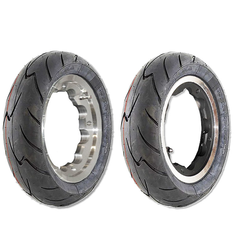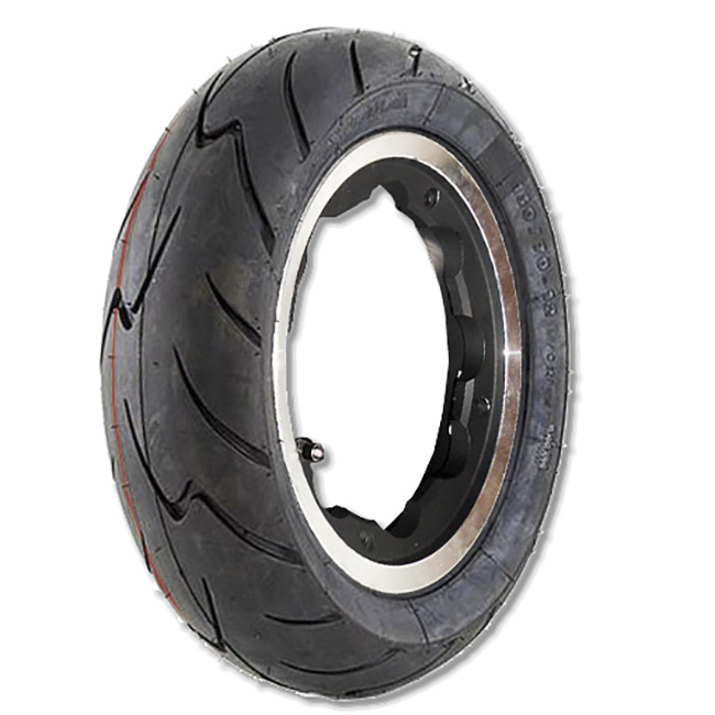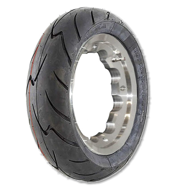 A complete wheel assembly, comprising SIP tubeless rims (select finish from dropdown box) and the sporty 3.50×10 Mitas Maxima tyre with sporty tread profile, and built with reinforced walls.
