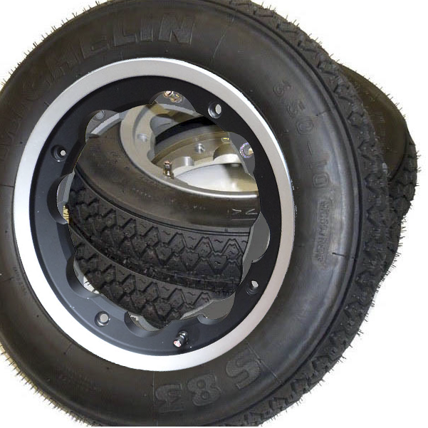 One SIP tubeless rim fitted with Michelin 3.50 x 10 S83 59J tyre.