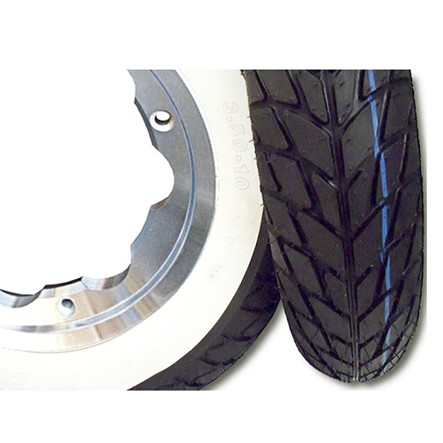 One SIP tubeless rim fitted with Mitas MC20 3.50 x 10 Whitewall 51P tyre.