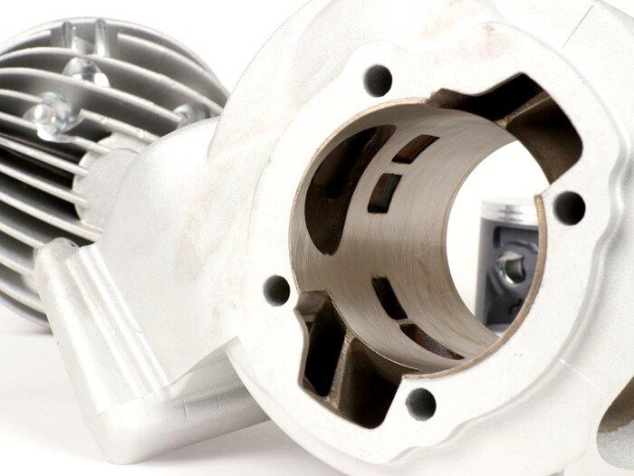 To be able to use the largest possible displacement, the cylinder does not have a spigot base that slots into the engine block. This technique allows a larger piston than usual to be used. With Ø68mm diameter this results in a displacement of 210cc with the standard stroke of 58mm (60mm stroke =218cc) . The kit has been designed to use a TV length conrod, 116mm, with 58 x 116 being the normal crankshaft for the kit. The long conrod improves the smoothness of running and ensures that the piston is positioned higher to prevent it from running out of the cylinder and tilting.
