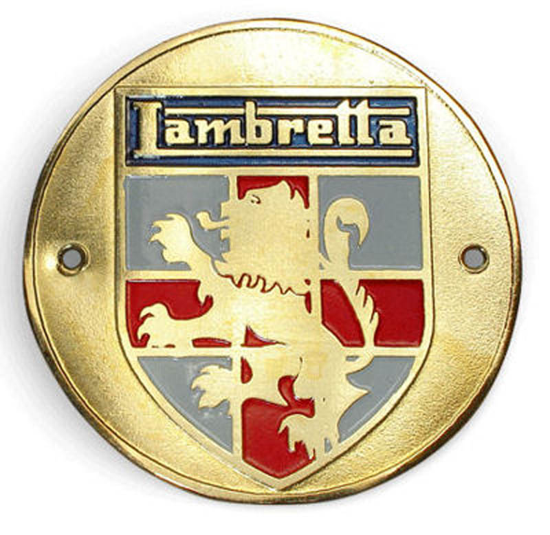 Round Lambretta legshield badge with lion rampant over George Cross shield.