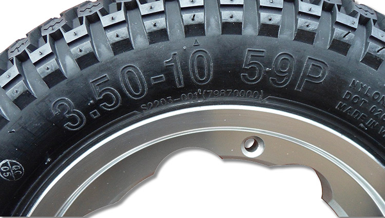 Tyre 3.50 x 10. Tyre rating .. 59P which is 243kg weight load and 150kph / 93mph speed rating.